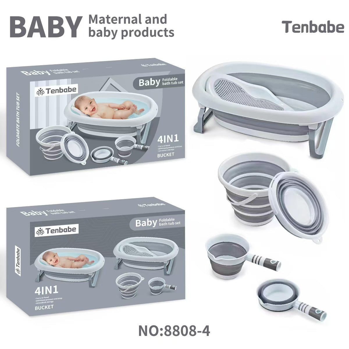 TENBABE 4-in-1 Baby Foldable Bathing Set with Bathtub, Bath Rack, Bucket, and Water Ladle.